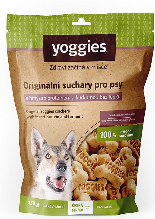- hypoalergenní, bezlepkové suchary pro psy od firmy Yoggies s hmyzím proteinem a kurkumou